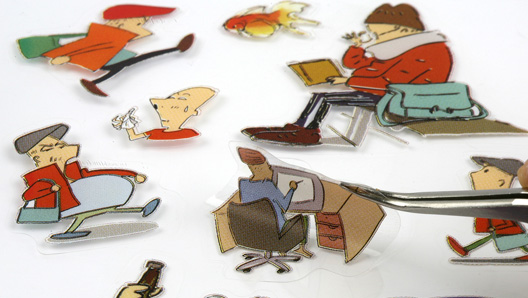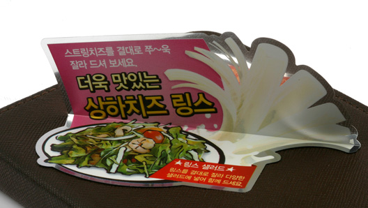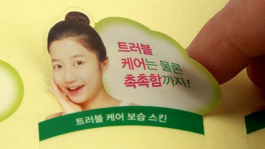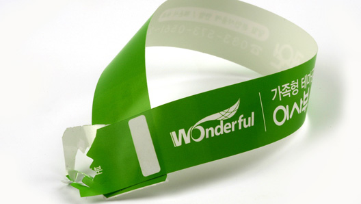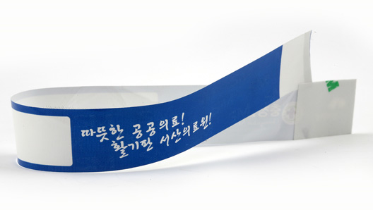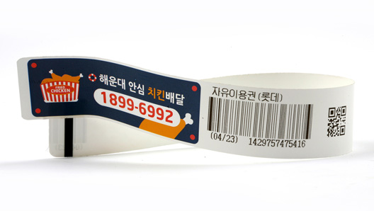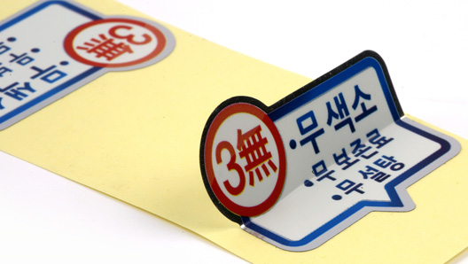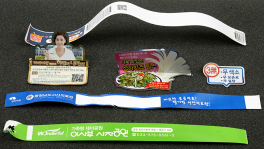 일반적 스티커와 달리 지정한 위치에 접착 처리가 되도록 특수 가공하는 스티커로 과일띠지,손목띠지 각종 와블로용으로 사용 되어짐.
